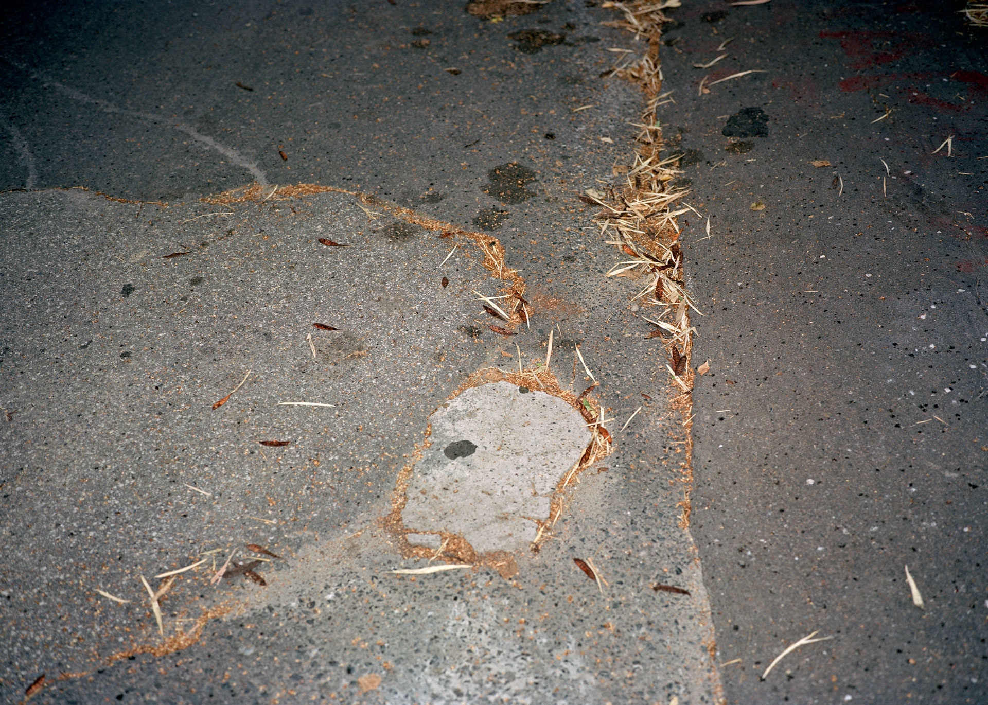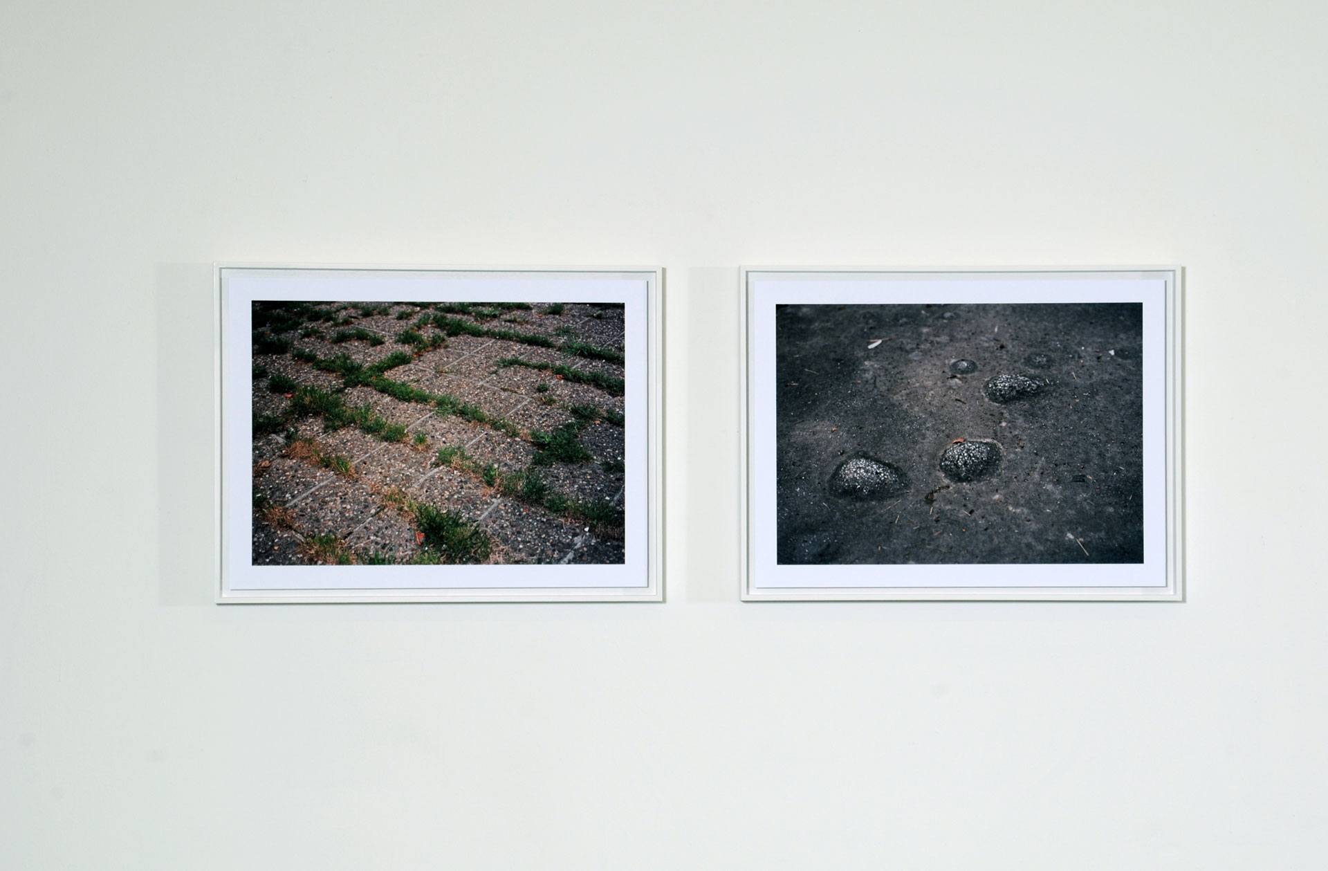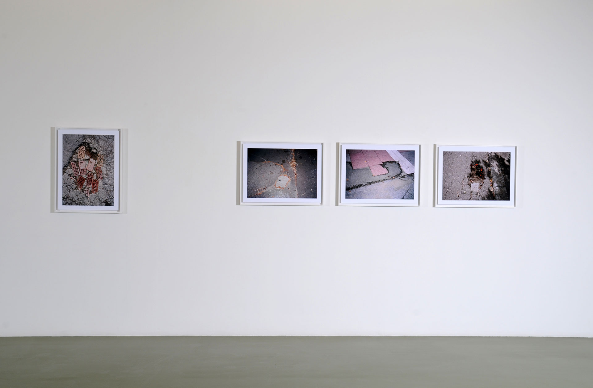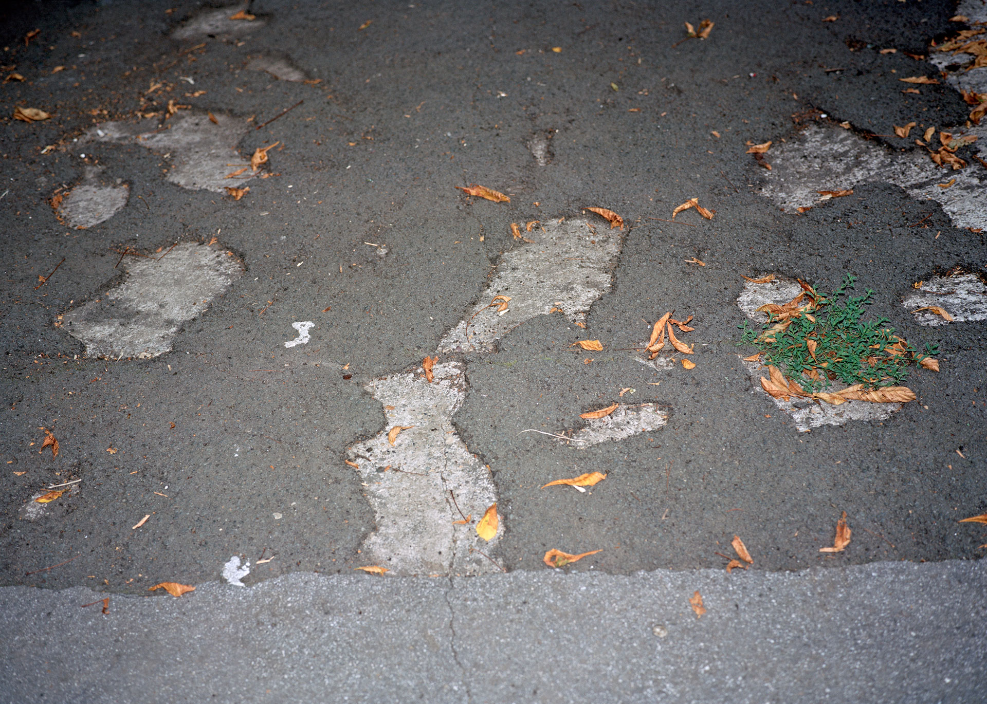 Que montrent en effet ces photographies ? Pour toutes vues de Belgrade, ce sont ici, pour la plupart, des vues de sols. Nids-de-poule et autres fissures, comme dessinées sur, ou gravées dans l’asphalte. Lignes imprévisibles, avant que de les suivre, car c’est le temps qui les a tracées, comme des rides. Lignes sur lesquelles on observe tantôt l’effort de l’homme pour en conjurer les effets, réparer ce qui a été usé, le recouvrir d’une nouvelle peau, tantôt l’effort de la nature, profitant de ce délitement, pour reprendre ce qu’on lui avait d’abord ôté, feuilles ou fruits arrivés là au hasard des vents, excroissances des herbes, celles qu’on dit mauvaises, venues patiemment du sous-sol, autant de touches de couleur, pour l’œil, sur camaïeu de gris.