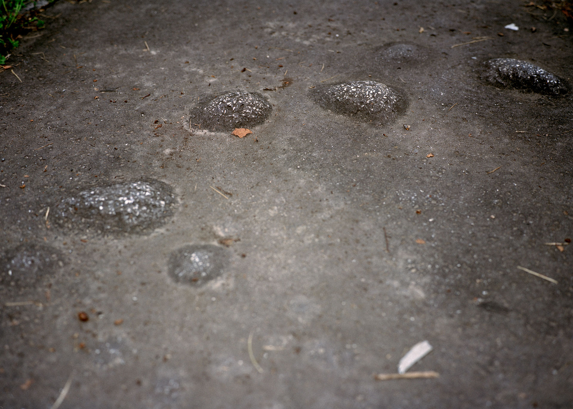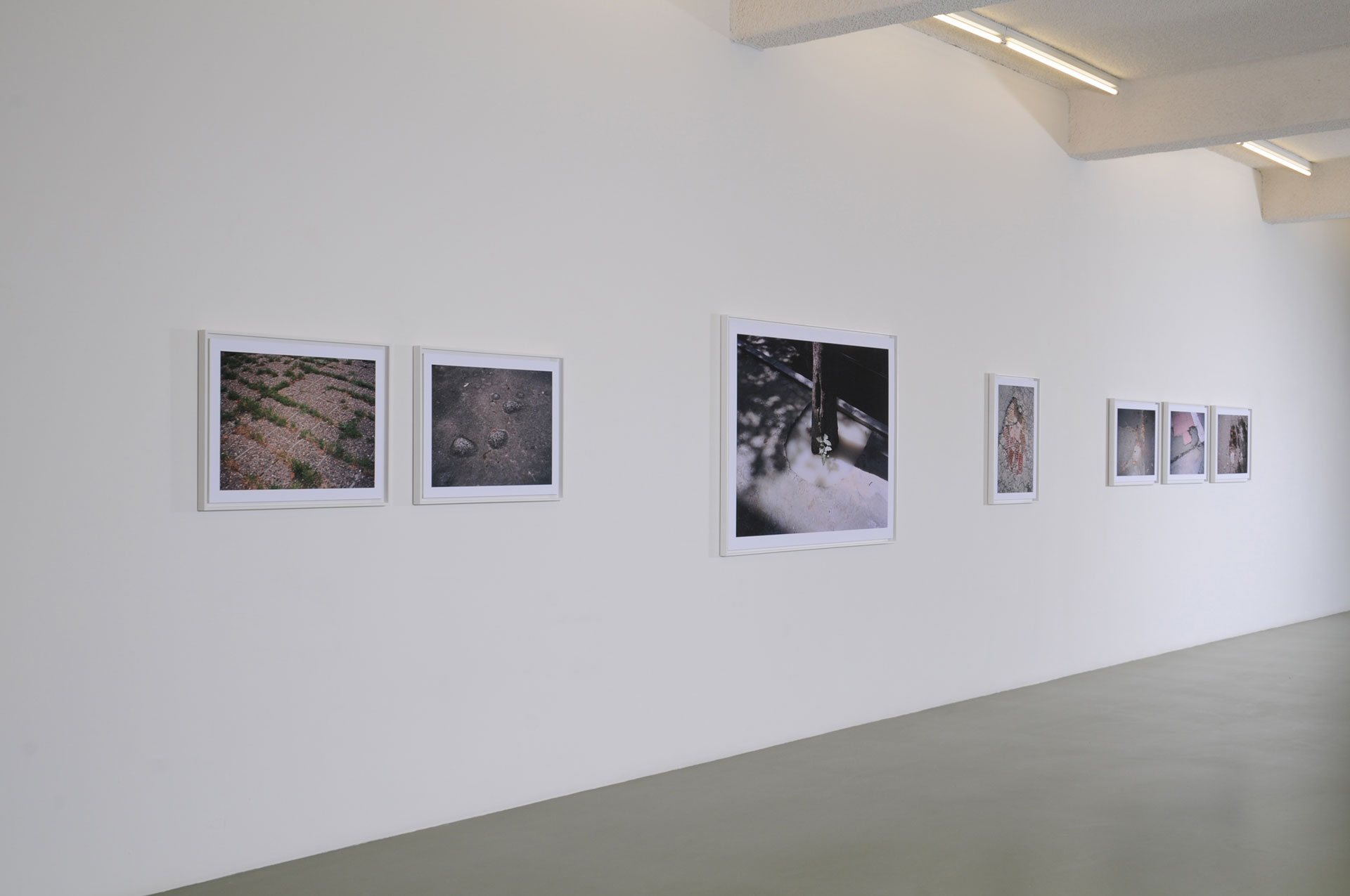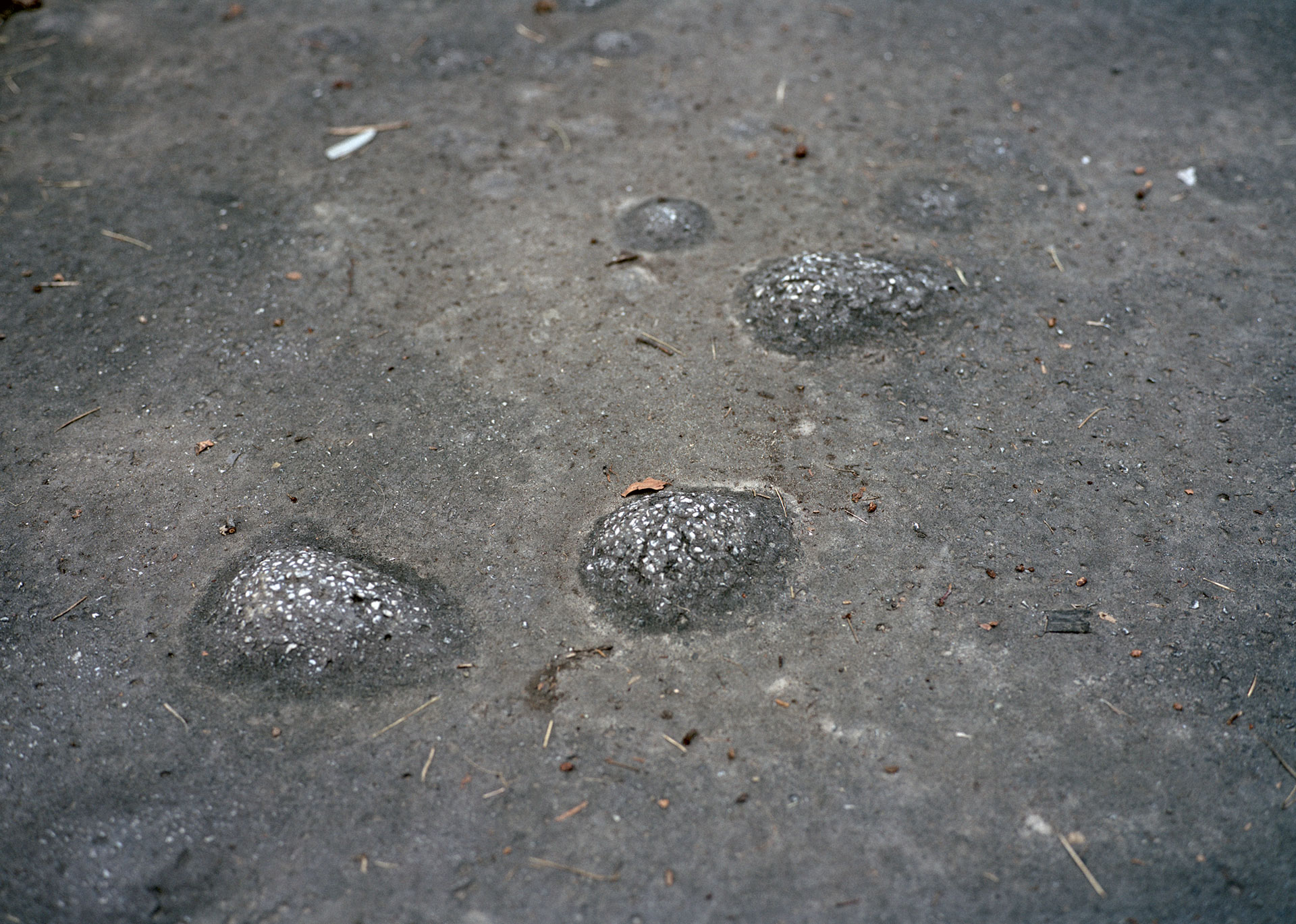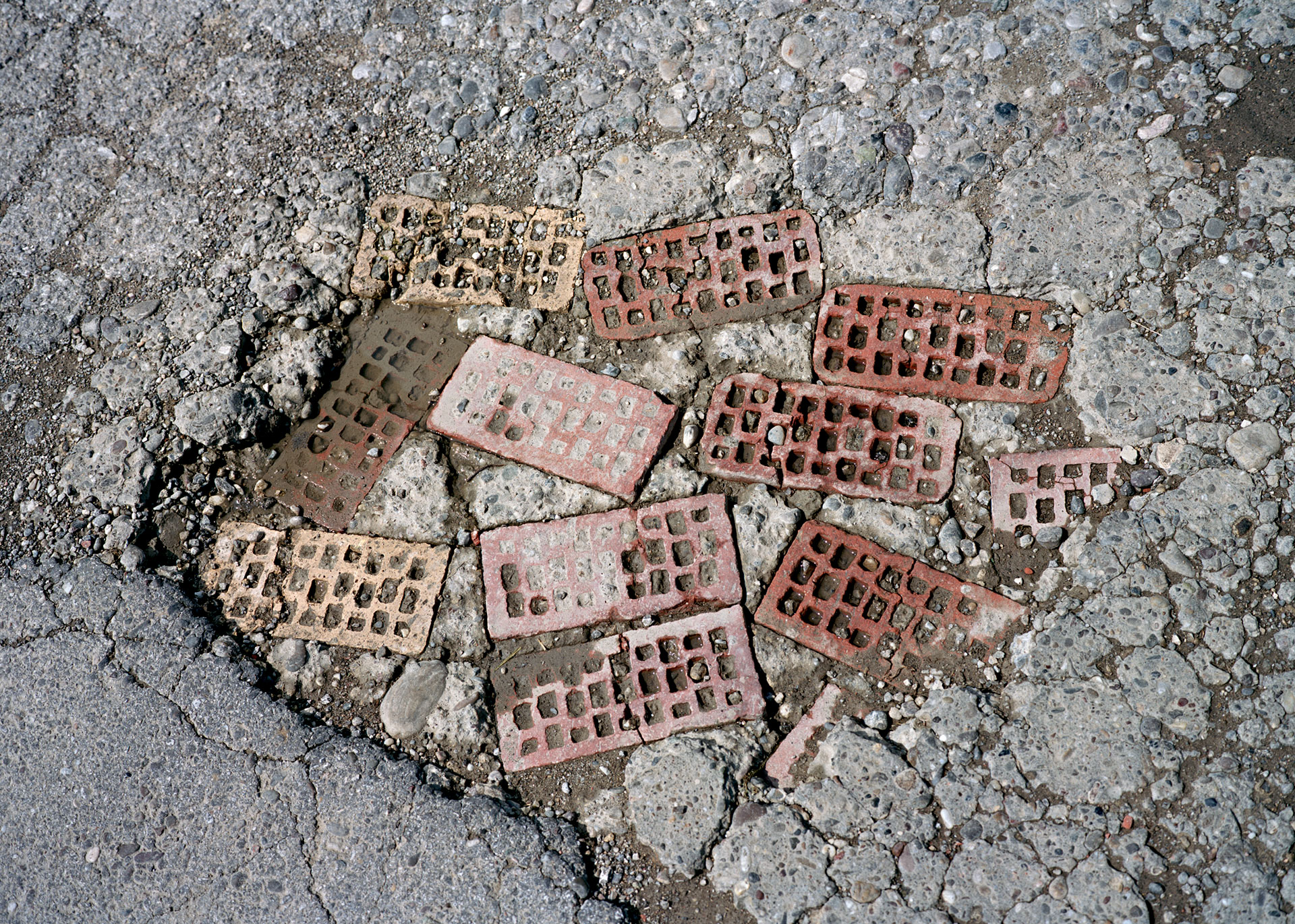 Que montrent en effet ces photographies ? Pour toutes vues de Belgrade, ce sont ici, pour la plupart, des vues de sols. Nids-de-poule et autres fissures, comme dessinées sur, ou gravées dans l’asphalte. Lignes imprévisibles, avant que de les suivre, car c’est le temps qui les a tracées, comme des rides. Lignes sur lesquelles on observe tantôt l’effort de l’homme pour en conjurer les effets, réparer ce qui a été usé, le recouvrir d’une nouvelle peau, tantôt l’effort de la nature, profitant de ce délitement, pour reprendre ce qu’on lui avait d’abord ôté, feuilles ou fruits arrivés là au hasard des vents, excroissances des herbes, celles qu’on dit mauvaises, venues patiemment du sous-sol, autant de touches de couleur, pour l’œil, sur camaïeu de gris.