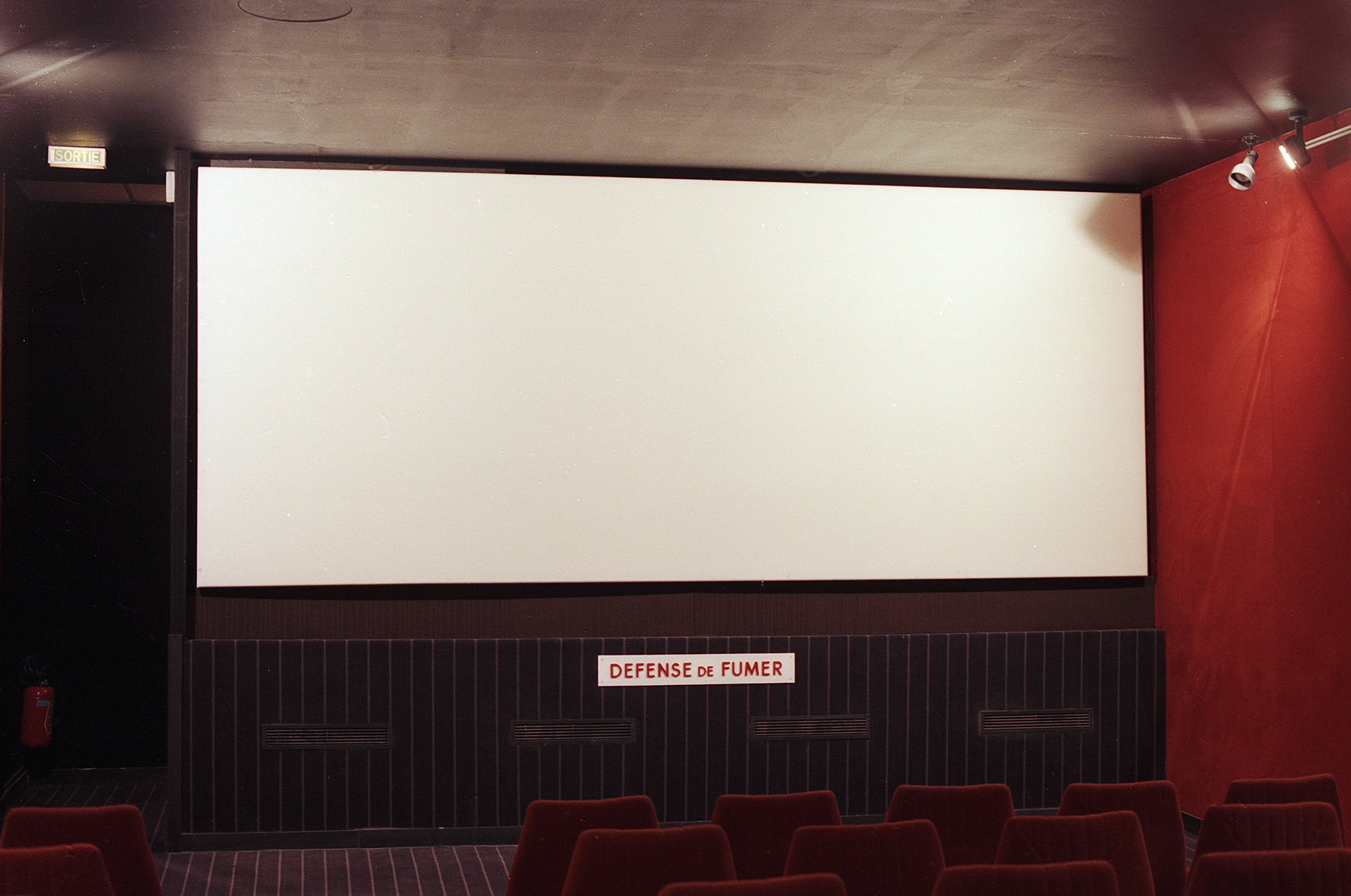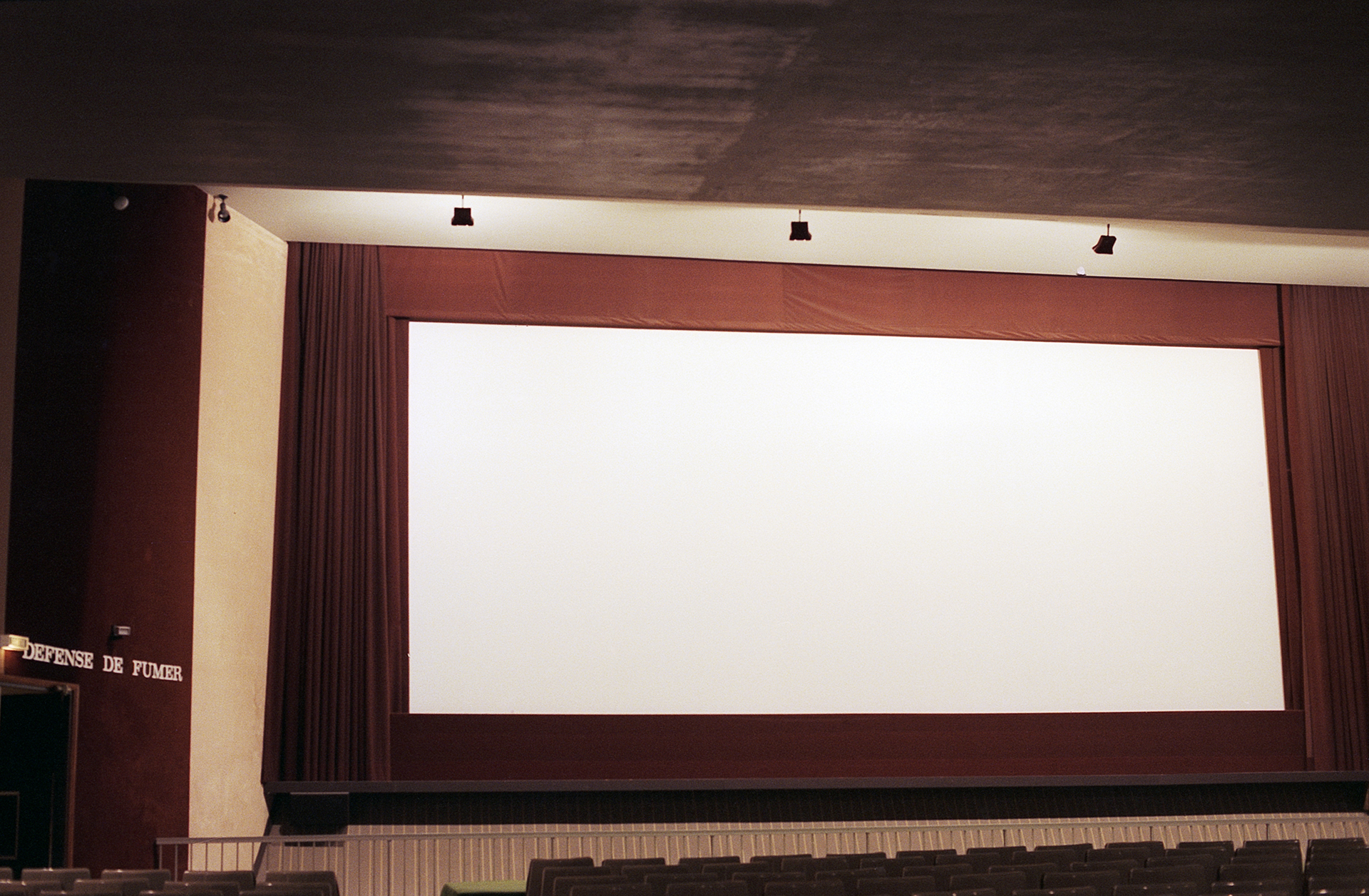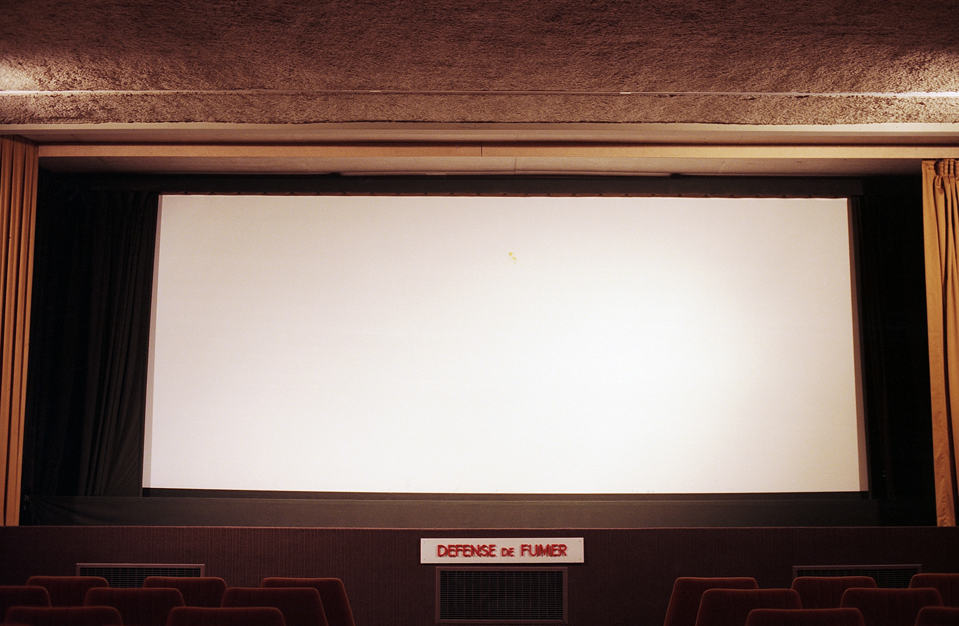 Ce sont des images prises à l’intérieur de salles de cinéma allumée et vidée de son public, sans que l’on sache si son cliché précède ou vient après la séance d’un film. Son objectif est tourné vers l’écran blanc, surface de projection matérielle mais également métaphorique. Ce travail s’inscrit dans une période-charnière de la carrière de Philippe Durand. En effet, au cours de sa formation à l’École des Beaux-Arts de Lyon au milieu des années quatre-vingt, Philippe Durand s’intéresse au cinéma expérimental et son œuvre naissante en prend alors la forme. Le développement de sa pratique de la photographie peut s’apparenter à un lent processus de déconstruction de son propre rapport au cinéma. Il commence par réaliser en 1987 des photographies d’objets à ta table lumineuse, puis entre 1988 et 1989, il prend des clichés en noir et blanc de pierres blanches de la Drôme. Dans ce travail, il recherche une sorte de dispositif naturel du cinéma qu’il décrit à la manière d’un haïku : “caillou blanc/ombre d’herbe/spectateur/soleil” ou “écran/image projetée/spectateur/projecteur”. À travers cette série de photographies dont Le Cinéma fait partie, Philippe Durand fait en quelque sorte son deuil du cinéma et semble nous dire, sans que l’on puisse néanmoins y déceler toute forme de nostalgie, que la séance est bel et bien finie.