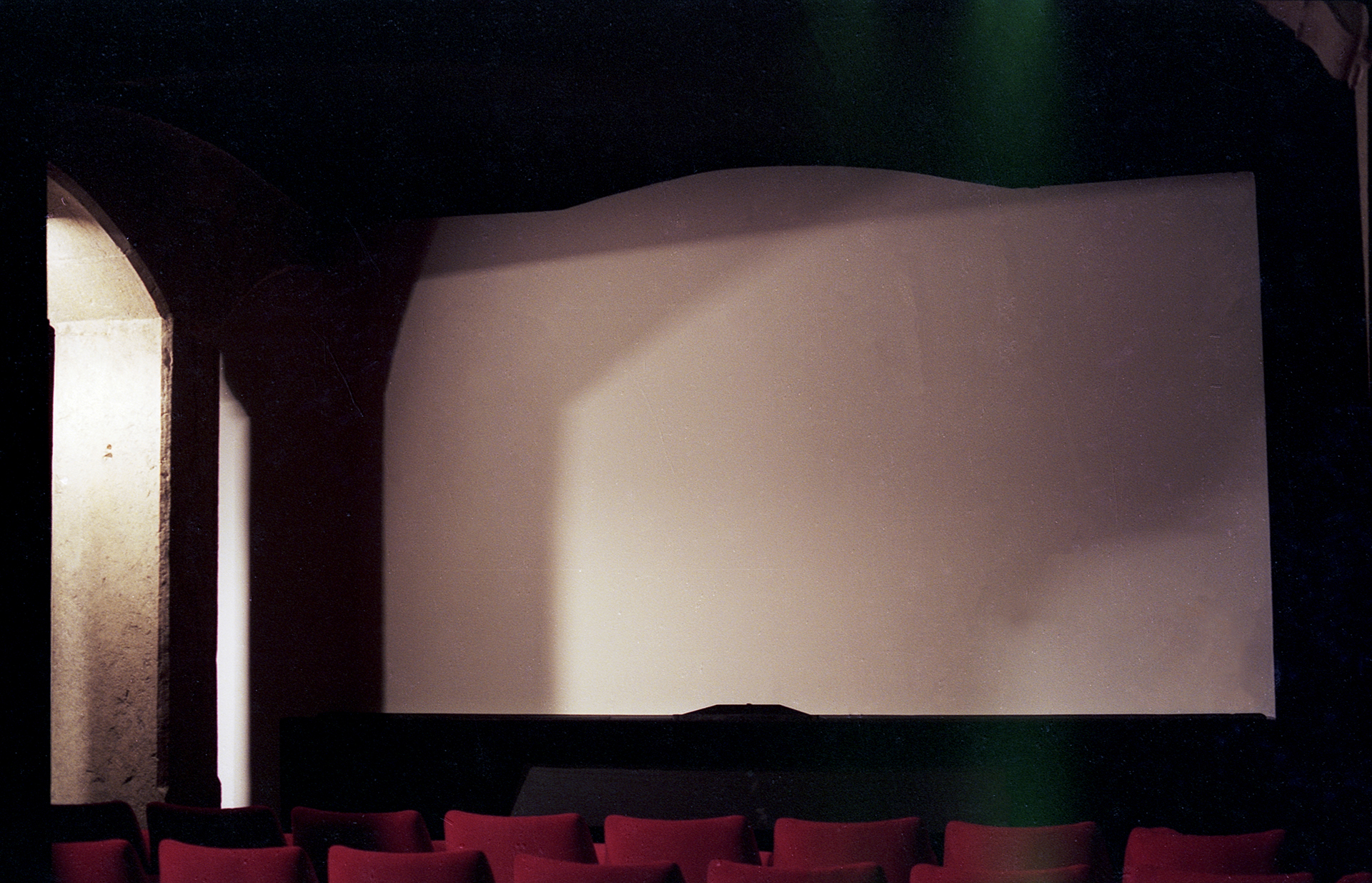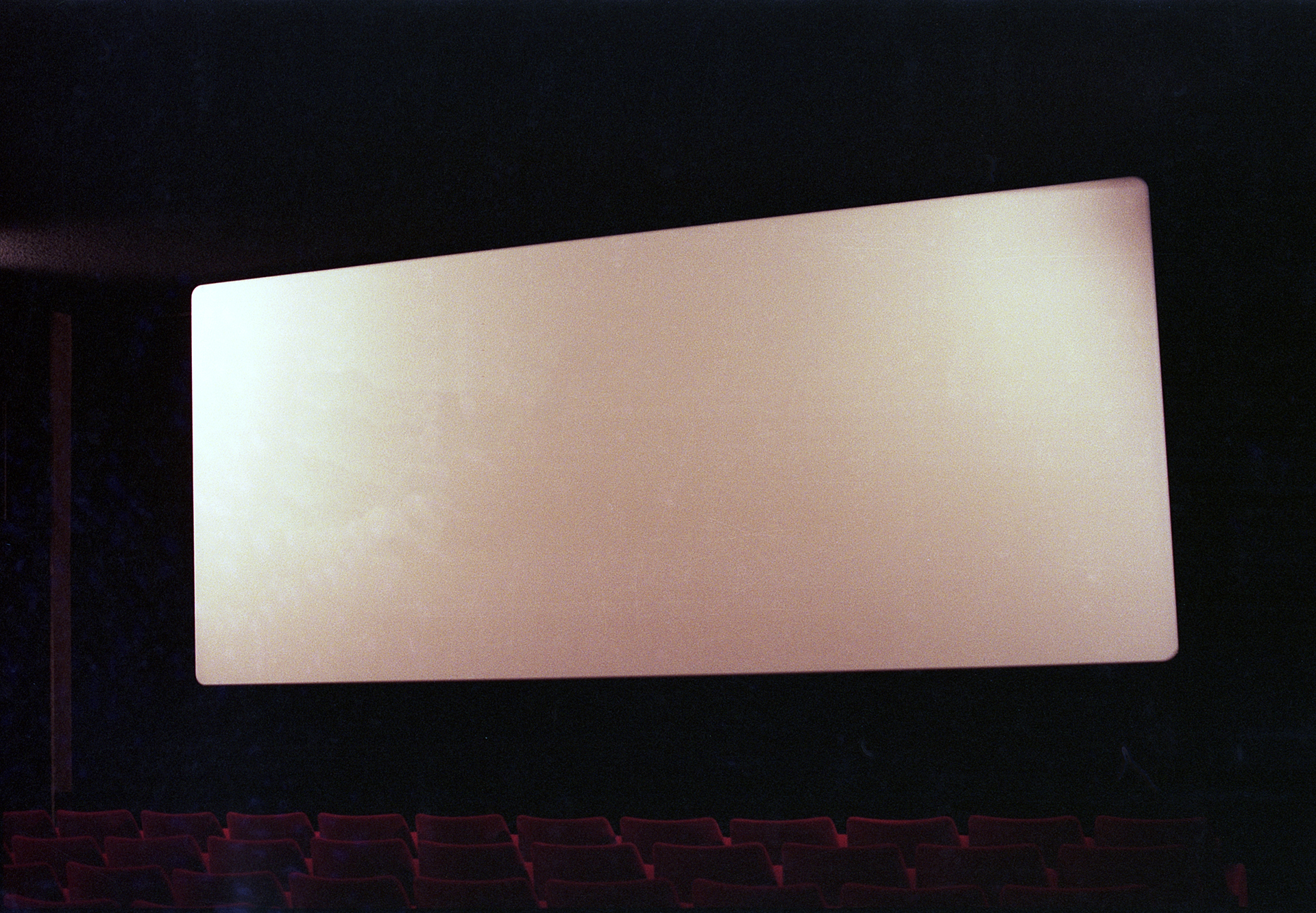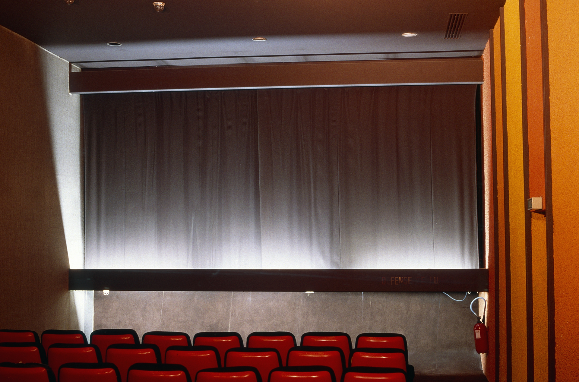 Ce sont des images prises à l’intérieur de salles de cinéma allumée et vidée de son public, sans que l’on sache si son cliché précède ou vient après la séance d’un film. Son objectif est tourné vers l’écran blanc, surface de projection matérielle mais également métaphorique. Ce travail s’inscrit dans une période-charnière de la carrière de Philippe Durand. En effet, au cours de sa formation à l’École des Beaux-Arts de Lyon au milieu des années quatre-vingt, Philippe Durand s’intéresse au cinéma expérimental et son œuvre naissante en prend alors la forme. Le développement de sa pratique de la photographie peut s’apparenter à un lent processus de déconstruction de son propre rapport au cinéma. Il commence par réaliser en 1987 des photographies d’objets à ta table lumineuse, puis entre 1988 et 1989, il prend des clichés en noir et blanc de pierres blanches de la Drôme. Dans ce travail, il recherche une sorte de dispositif naturel du cinéma qu’il décrit à la manière d’un haïku : “caillou blanc/ombre d’herbe/spectateur/soleil” ou “écran/image projetée/spectateur/projecteur”. À travers cette série de photographies dont Le Cinéma fait partie, Philippe Durand fait en quelque sorte son deuil du cinéma et semble nous dire, sans que l’on puisse néanmoins y déceler toute forme de nostalgie, que la séance est bel et bien finie.