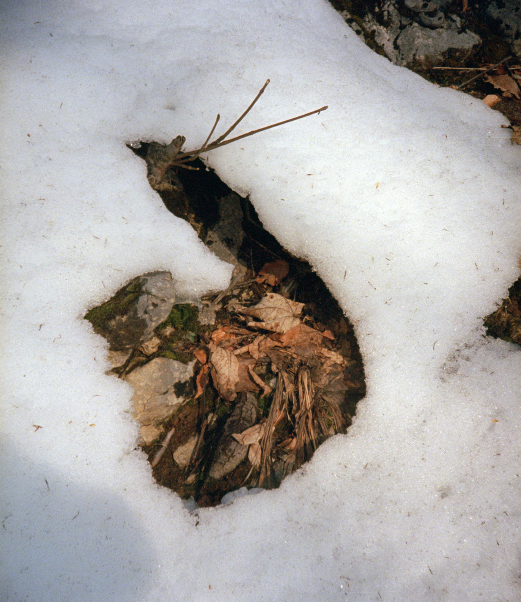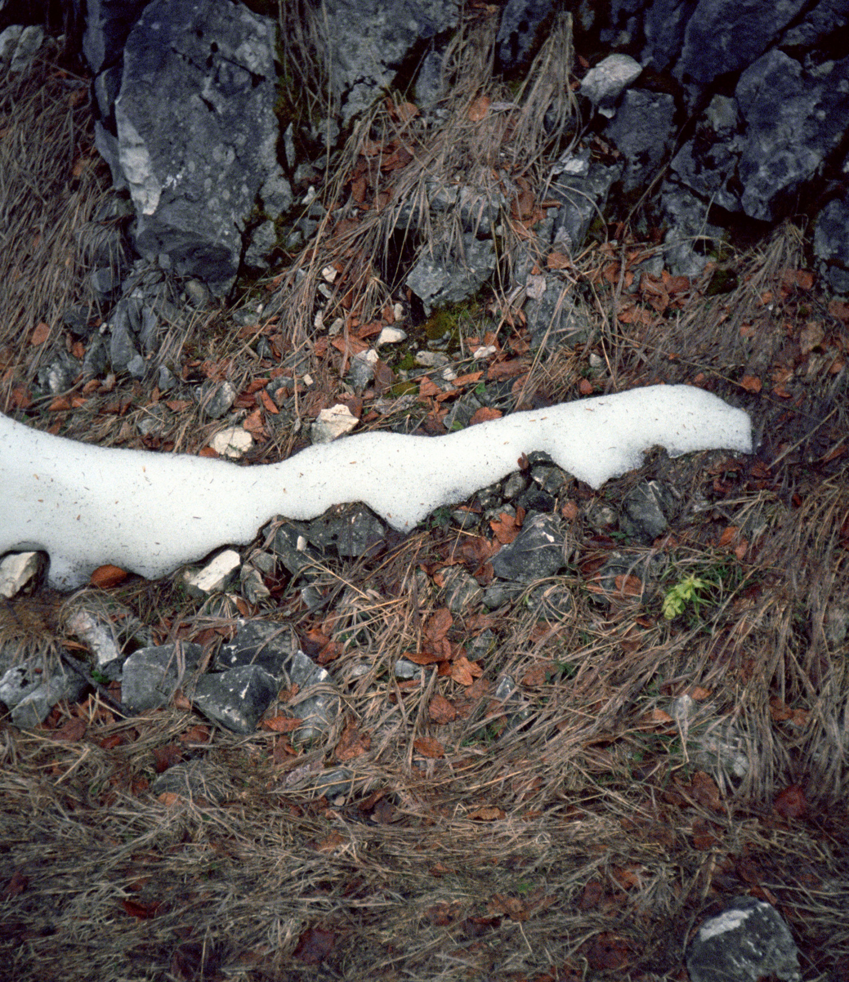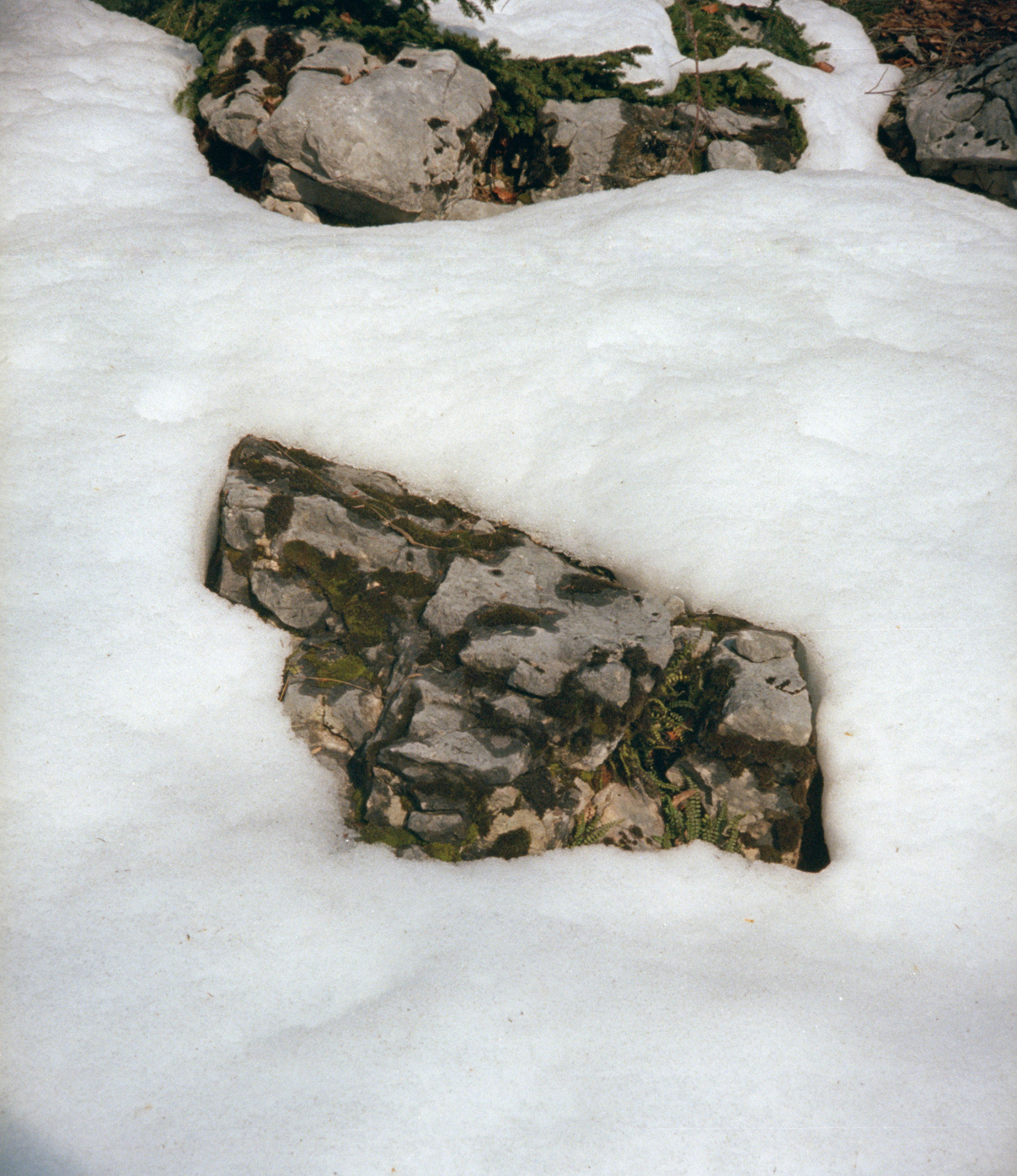 À l’instar d’un collage, chaque image en effet s’attache à révéler des formes découpées ou générées par de la neige, confrontant ainsi l’infiniment lent du minéral à l’infiniment vite de la neige. Les tirages photographiques relèvent d’un procédé lenticulaire produisant une sensation low- tech de relief ou qui changent en fonction de l’angle de vue du spectateur. Avec cette série, il poursuit son exploration du réel autant que celle du paradigme photographique.