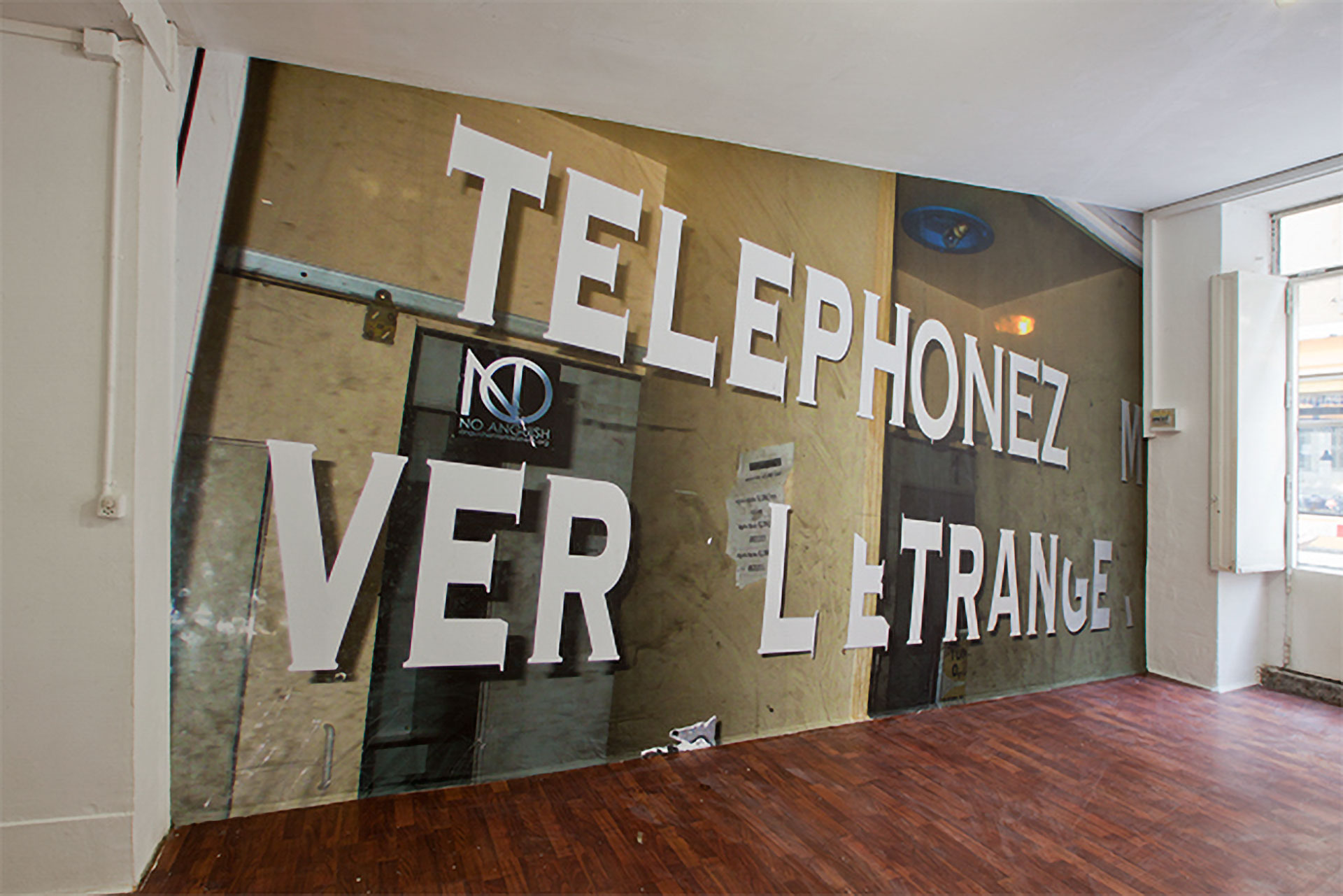 Café internet désaffecté , Palais du commerce à Belleville. Certaines lettres adhésives sont manquantes, impression “dos-bleu”, dimensions variables